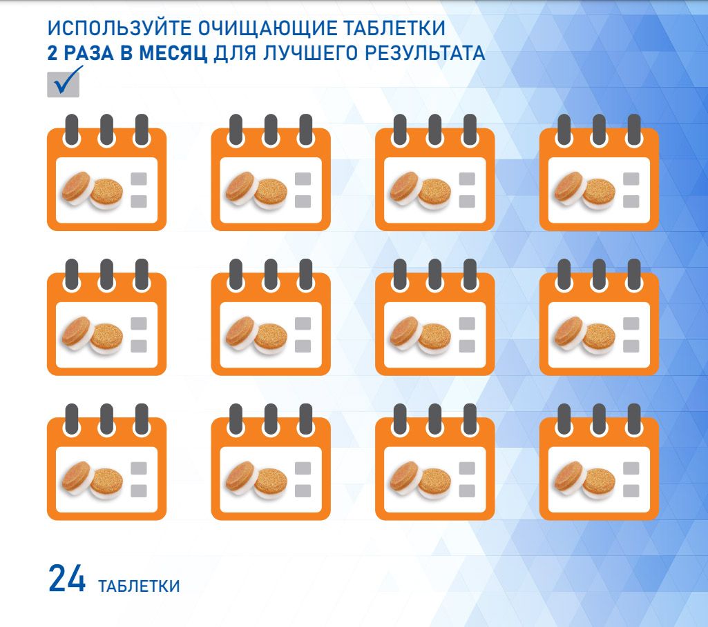 Таблетки проникают в труднодоступные места и удаляют загрязнения, не повреждая при этом поверхности измельчителя. Для использования таблеток необходимо поместить их в измельчитель и залить водой. Затем следует включить измельчитель на несколько минут, чтобы химические вещества начали действовать.
